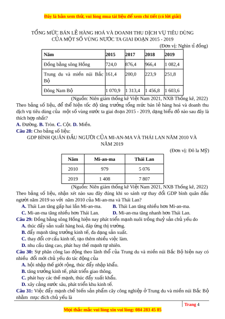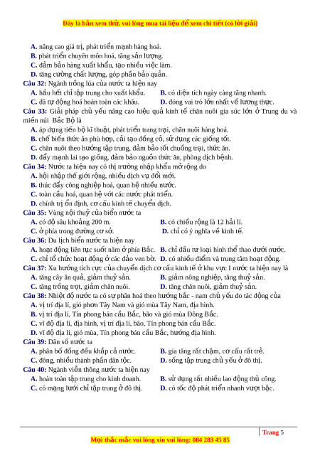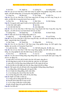 C. Cảng Vũng Áng. D. Cảng C a ử Gianh. Câu 2: D c ị h v ụ ở Đồng b ng ằ sông H ng ồ hi n ệ nay A. do Nhà nư c ớ n m ắ gi . ữ B. phát tri n ể đa d ng. ạ C. chỉ có ở ven bi n ể . D. có tỉ tr ng ọ r t ấ th p ấ . Câu 3: M t ộ trong nh ng ữ nguồn năng lư ng ợ có giá tr ị ở nư c ớ ta là A. quặng sắt. B. mangan. C. quặng đồng. D. dầu khí. Câu 4: Công nghi p ệ nư c ớ ta hi n ệ nay A. có c ơ cấu không đổi. B. phát tri n ể đa ngành.