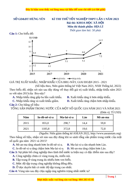 Đây là bản xem th , vu ử i lòng mua tài li u ệ đ xe ể m chi ti t ế (có l i ờ gi i ả ) S Ở GD&ĐT H NG Ư YÊN KÌ THI TH Ử T T Ố NGHI P Ệ THPT L N Ầ 1 NĂM 2023 Bài thi: KHOA H C Ọ XÃ H I Ộ Môn thi thành ph n ầ : Đ A Ị LÍ Th i
