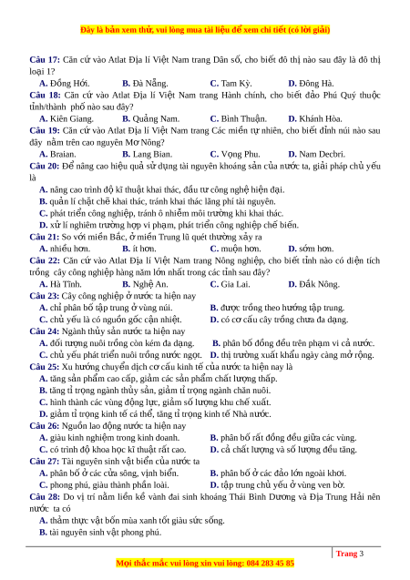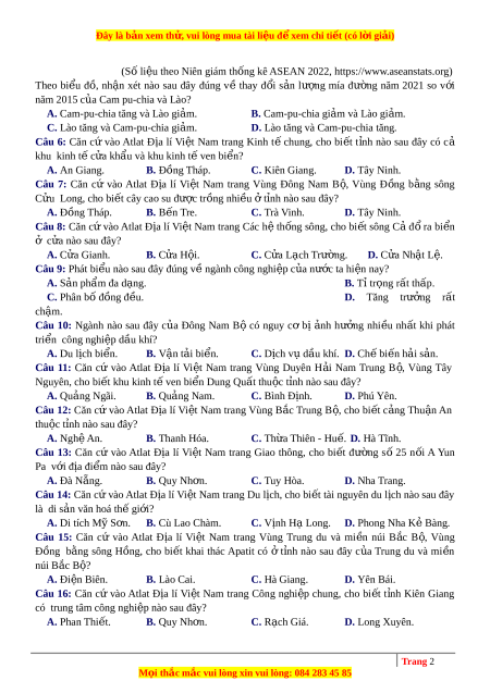 ệ Nam trang Giao thông, cho bi t ế đư ng ờ s ố 25 n i ố A Yun Pa v i ớ địa đi m ể nào sau đây? A. Đà Nẵng. B. Quy Nh n. ơ C. Tuy Hòa. D. Nha Trang. Câu 14: Căn c ứ vào Atlat Đ a ị lí Vi t ệ Nam trang Du l c ị h, cho bi t ế tài nguyên du l c ị h nào sau đây là di s n ả văn hoá th ế gi i? ớ A. Di tích M ỹ S n. ơ B. Cù Lao Chàm.
