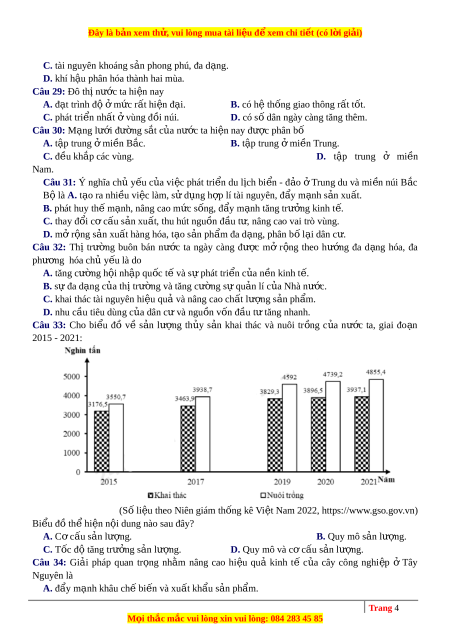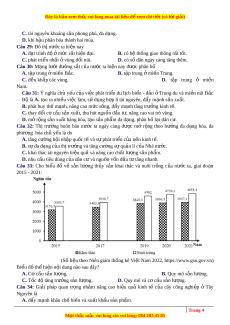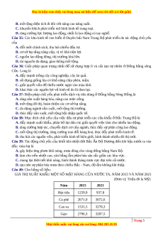 ộ là A. tạo ra nhi u ề vi c ệ làm, s ử d ng ụ h p ợ lí tài nguyên, đ y ẩ m nh ạ s n ả xu t ấ . B. phát huy th ế m nh ạ , nâng cao m c ứ s ng ố , đ y ẩ m nh ạ tăng trư ng ở kinh t . ế C. thay đổi c ơ c u ấ s n ả xu t ấ , thu hút ngu n ồ đ u ầ t , ư nâng cao vai trò vùng. D. m ở r ng ộ sản xuất hàng hóa, t o ạ s n ả ph m ẩ đa d ng ạ , phân b ố l i ạ dân c . ư Câu 32: Thị trư ng ờ buôn bán nư c ớ ta ngày càng đư c ợ mở r ng ộ theo hư ng ớ đa d ng ạ hóa, đa phư ng ơ hóa ch ủ y u ế là do A. tăng cư ng ờ h i ộ nhập qu c ố t ế và s ự phát tri n ể c a ủ n n ề kinh t . ế B. sự đa d ng ạ c a ủ th ịtrư ng ờ và tăng cư ng ờ s ự qu n ả lí c a ủ Nhà nư c ớ .