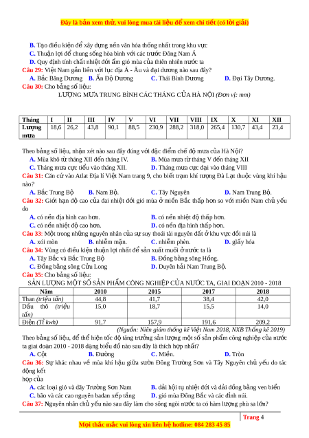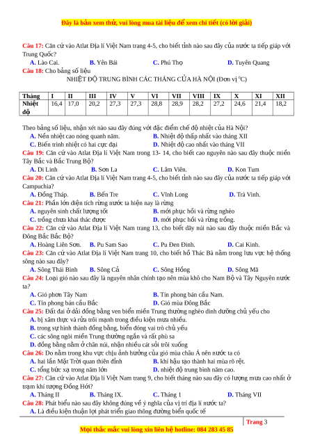 Đây là bản xem th , vu ử i lòng mua tài li u ệ đ xe ể m chi ti t ế (có l i ờ gi i ả ) Câu 17: Căn c và ứ o Atlat Đ a ị lí Vi t ệ Nam trang 4-5, cho bi t ế t nh ỉ nào sau đây c a ủ nư c ớ ta ti p ế giáp v i ớ Trung Qu c ố ? A. Lào Cai. B. Yên Bái C. Phú Thọ D. Tuyên Quang Câu 18: Cho bảng s l ố i u ệ NHIỆT Đ