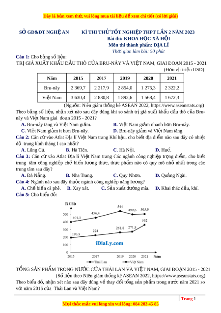 Đây là bản xem th , vu ử i lòng mua tài li u ệ đ xe ể m chi ti t ế (có l i ờ gi i ả ) S Ở GD&ĐT NGH Ệ AN KÌ THI TH Ử T T Ố NGHI P Ệ THPT L N Ầ 2 NĂM 2023 Bài thi: KHOA H C Ọ XÃ H I Ộ Môn thi thành ph n ầ : Đ A Ị LÍ Th i