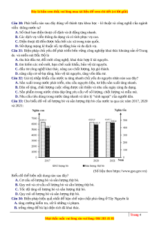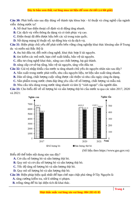 (Số liệu theo https://www.gso.gov.vn) Bi u ể đồ th ể hi n ệ n i ộ dung nào sau đây? A. C ơ cấu s ố lư ng ợ bò và sản lư ng ợ th t ị bò. B. Quy mô và c ơ c u ấ s ố lư ng ợ bò và s n ả lư ng ợ th t ị bò. C. T c ố đ ộ tăng s ố lư ng ợ bò và s n ả lư ng ợ th t ị bò. D. Quy mô số lư ng ợ bò và s n ả lư ng ợ th t ị bò. Câu 34: Bi n ệ pháp hi u ệ qu ả nh t ấ đ ể h n ạ ch ế n n ạ ch t ặ phá r ng ừ ở Tây Nguyên là A. tăng cư ng ờ ki m ể tra, x ử lí nh ng ữ vi ph m ạ . B. trồng rừng đ ể bù lại di n ệ tích đã khai thác. Trang 4 M i