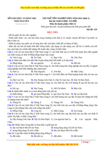Đề thi thử Địa Lí Sở Thái Nguyên lần 1 năm 2021