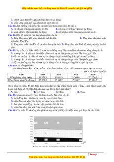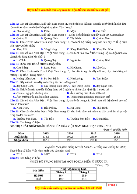 GIÁ TRỊ XUẤT NHẬP KHẨU HÀNG HÓA C A Ủ VI T Ệ NAM GIAI ĐO N Ạ 2015 – 2018 (Đ n ơ v : t ị ỷ đôla M ) ỹ Năm 2015 2016 2017 2018 Xuất kh u ẩ 174,6 190,5 230,0 261,8 Nhập kh u ẩ 182,5 192,8 231,0 257,6 (Ngu n: Ni ồ ên giám th ng ố kê Vi t ệ Nam 2019, T ng c ổ c ụ Th ng ố kê, 2020) Theo bảng s l ố iệu, Vi t ệ Nam xu t ấ siêu vào năm nào? A. 2018 B. 2017. C. 2015. D. 2016. Câu 23: Cho bảng s l ố i u: ệ NHIỆT Đ Ộ TRUNG BÌNH T I M Ạ T Ộ S Đ Ố A Ị ĐI M Ể N Ở C ƯỚ TA (Đ n ơ v : ị 0C) ệ ộ Địa đi m ể Nhi t đ trunng bình Tháng 1 Tháng 7 Hà N i ộ 16,4 28,9 Huế 19,7 29,4 Trang 2 M i ọ thắc m c