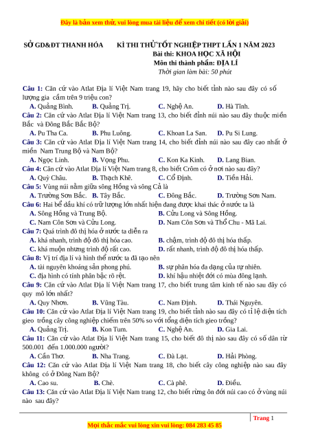 Ở GD&ĐT THANH HÓA KÌ THI TH Ử T T Ố NGHI P Ệ THPT L N Ầ 1 NĂM 2023 Bài thi: KHOA H C Ọ XÃ H I Ộ Môn thi thành ph n ầ : Đ A Ị LÍ Th i