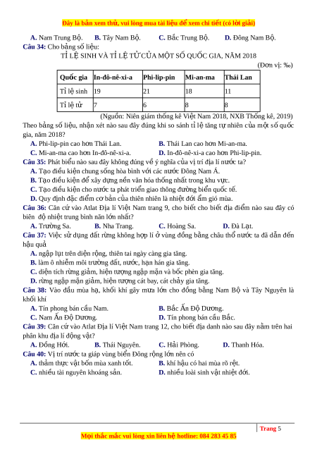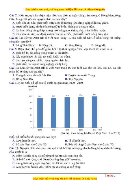 Câu 27: Quy mô dân số ở các đô th ịc a ủ nư c ớ ta ngày càng l n ớ là do nguyên nhân ch ủ y u ế nào sau đây? A. D ễ tìm ki m ế vi c ệ làm. B. Đi u ề ki n ệ s ng ố h p ấ d n ẫ . C. Có khả năng v ề thu nh p ậ . D. Phát tri n ể công nghi p ệ . Câu 28: Căn c ư vào Atlat Đ a ị lí Vi t ệ Nam trang 8, cho bi t ế khoáng s n ả Asen có ở t nh ỉ nào sau đây? A. Quảng Ngãi. B. Ninh Thuận. C. Kom Tum. D. Bình Thuận. Câu 29: Phần l n ớ sông ngòi nư c ớ ta nh , ỏ ng n ắ và d c ố là do tác đ ng ộ tr c ự ti p ế c a ủ nhân t ố nào sau đây?