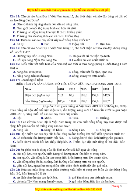 ể đồ nào sau đây thích h p ợ nh t? ấ A. C t ộ . B. Mi n. ề C. Tròn. D. Đư ng. ờ Câu 18: Căn c ư vào Atlat Đ a ị lí Vi t ệ Nam trang 10, cho bi t ế đ ng ồ b ng ằ Tuy Hòa đư c ợ mở r ng ộ b i ở phù sa c a ủ h ệ th ng ố sông nào sau đây? A. Sông Cái. B. Sông Trà Khúc. C. Sông Côn. D. Sông Ba. Câu 19: Đ c ặ đi m ể nào sau đây c a ủ bi n ể Đông có nh ả hư ng ở l n ớ nh t ấ đ n ế t ự nhiên nư c ớ ta? A. Có di n ệ tích l n, ớ lư ng ợ nư c ớ d i ồ dào. B. Nóng m ẩ và ch u ị nh ả hư ng ở c a ủ gió mùa. C. Bi n ể kín và có các h i ả l u ư ch y ả khép kín. D. Th m ề l c ụ đ a ị mở r ng ộ ở hai đ u ầ B c ắ - Nam.