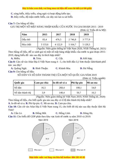 Câu 7: Cho bảng số li u: ệ GIÁ TR Ị MỘT SỐ M T Ặ HÀNG NH P Ậ KH U Ẩ C A Ủ NƯ C Ớ TA GIAI ĐO N Ạ 2015 - 2019 (Đ n ơ vị: Triệu đô la M ) ỹ Năm 2015 2017 2018 2019 Dầu thô 83,4 476,5 2 746,8 3 777,9 Hóa ch t ấ 3 133,6 4 122,9 5 164,7 5 128,5 (Nguồn: Niên giám th ng ố kê Vi t ệ Nam 2020, NXB Th ng ố kê, 2021) Theo bảng s ố li u,
