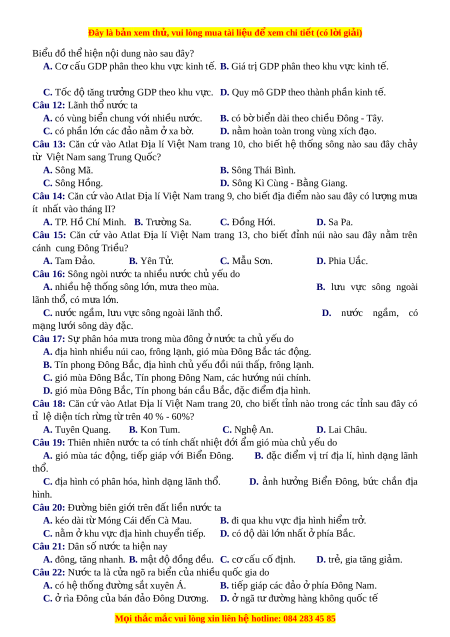 C. địa hình có phân hóa, hình d ng ạ lãnh th . ổ D. ảnh hư ng ở Bi n ể Đông, b c ứ ch n ắ đ a ị hình. Câu 20: Đư ng ờ biên gi i ớ trên đ t ấ li n ề nư c ớ ta A. kéo dài t ừ Móng Cái đ n ế Cà Mau. B. đi qua khu v c ự đ a ị hình hi m ể tr . ở C. nằm ở khu v c ự đ a ị hình chuy n ể ti p ế . D. có đ ộ dài l n ớ nh t ấ ở phía B c ắ . Câu 21: Dân s ố nư c ớ ta hi n ệ nay