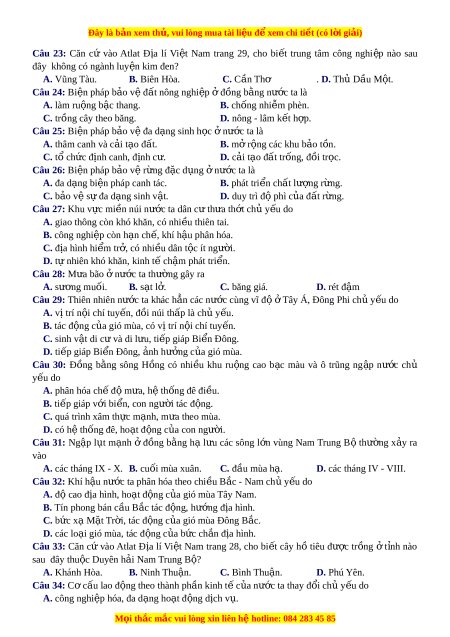Câu 23: Căn cứ vào Atlat Đ a ị lí Vi t ệ Nam trang 29, cho bi t ế trung tâm công nghi p ệ nào sau đây không có ngành luy n ệ kim đen? A. Vũng Tàu. B. Biên Hòa. C. Cần Thơ . D. Thủ Dầu M t ộ . Câu 24: Bi n ệ pháp b o ả v ệ đ t ấ nông nghi p ệ ở đ ng ồ b ng ằ nư c ớ ta là A. làm ru ng ộ b c ậ thang. B. chống nhi m ễ phèn.