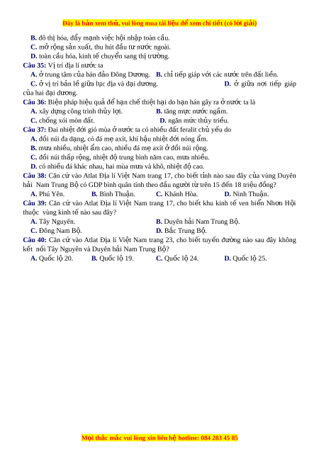 Câu 33: Căn cứ vào Atlat Đ a ị lí Vi t ệ Nam trang 28, cho bi t ế cây h ồ tiêu đư c ợ tr ng ồ ở t nh ỉ nào sau đây thu c ộ Duyên h i ả Nam Trung B ? ộ A. Khánh Hòa. B. Ninh Thuận. C. Bình Thuận. D. Phú Yên. Câu 34: C ơ cấu lao đ ng ộ theo thành ph n ầ kinh t ế c a ủ nư c ớ ta thay đ i ổ ch ủ y u ế do A. công nghi p ệ hóa, đa d ng ạ ho t ạ đ ng ộ d c ị h v . ụ M i