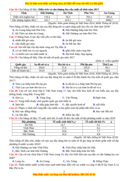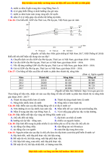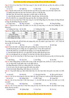 Câu 22: Phạm vi lãnh thổ vùng đất c a ủ nư c ớ ta bao g m ồ toàn b ph ộ n đ ầ t ấ li n ề và an A. khu v c ự đ ng ồ bằng B. khu v c ự đ i ồ núi C. các hải đảo D. thềm l c ụ đ a ị Câu 23: Cho bảng s l ố i u: ệ Tỉ suất sinh thô, t s ỉ u t ấ t t ử hô c a ủ m t ộ s đ ố a ị phư ng ơ nư c ớ ta năm 2018 Địa phư n ơ g