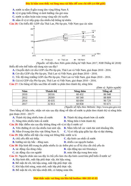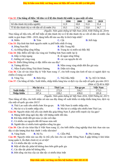 C. có nhiều núi cao nhất nư c ớ ta . D. đ a ị hình thấp, h p nga ẹ ng . Câu 19: Cho bảng s l ố i u: ệ Dân s m ố t ộ s qu ố c ố gia năm 2017 (Đ n v ơ : ị tri u ng ệ ư i ờ ) Qu c ố gia In-đô-nê-xi-a Ma-lai-xi-a Phi-lip-pin Thái Lan T ng ổ s dâ ố n 264,0 31,6 105,0 66,1 Dân s t ố hành thị 143,9 23,8 46,5 34,0 (Ngu n: ồ Niên giám th ng ố kê Vi t