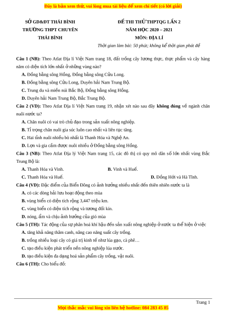 Đề thi thử Địa Lí trường Chuyên Thái Bình lần 2 năm 2021