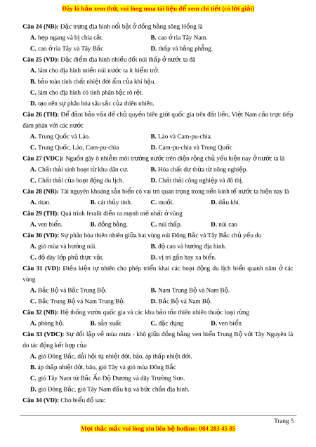 ớ phần lãnh thổ phía Bắc nư c ớ ta chủ y u l ế à do nguyên nhân nào? A. Đ c ộ ao trung bình c a ủ đ a ị hình th p h ấ n. ơ B. Ít ch u ị ảnh hư ng c ở a ủ gió mùa Đông B c ắ C. Ch u t ị ác đ ng m ộ ạnh c a ủ gió mùa Tây Nam. D. Ch u t ị ác đ ng c ộ a ủ Bi n Đ ể ông sâu s c ắ h n. ơ Câu 14 (TH): Nh ng l ữ u ư v c ự sông su i ố có đ d ộ c ố l n t ớ hư ng ờ d x ễ y ra ả A. ngập l t ụ . B. m a ư đá. C. lũ quét. D. hạn hán. Trang 3 M i ọ thắc m c
