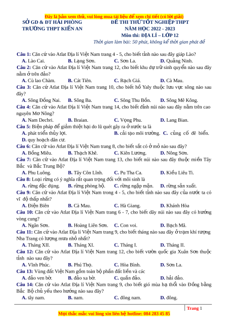 ệ đ xe ể m chi ti t ế (có l i ờ gi i ả ) S Ở GD & ĐT H I Ả PHÒNG Đ Ề THI THỬ T T Ố NGHI P Ệ THPT TRƯ NG Ờ THPT KI N Ế AN NĂM H C Ọ 2022 - 2023 Môn thi: Đ A Ị LÍ – L P Ớ 12 Th i