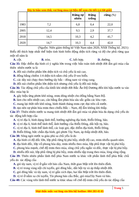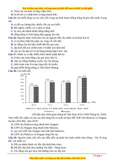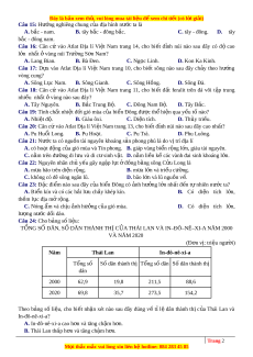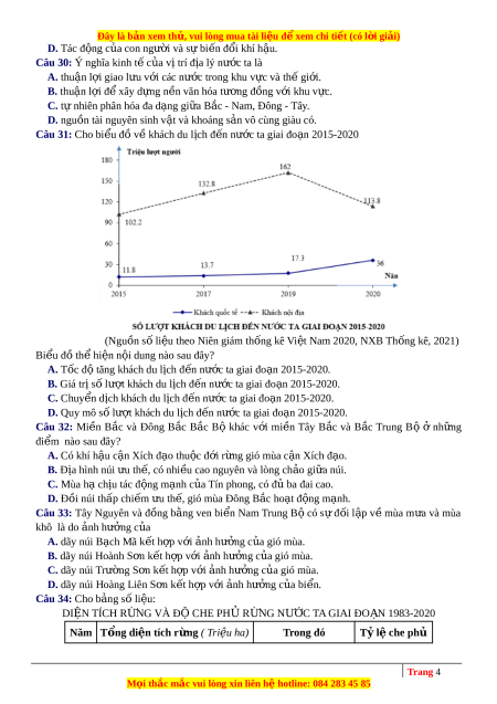 D. nguồn tài nguyên sinh v t ậ và khoáng s n ả vô cùng giàu có. Câu 31: Cho bi u ể đồ v ề khách du l c ị h đ n ế nư c ớ ta giai đo n ạ 2015-2020 (Nguồn số li u ệ theo Niên giám th ng ố kê Vi t ệ Nam 2020, NXB Th ng ố kê, 2021) Bi u ể đồ th ể hi n ệ n i ộ dung nào sau đây? A. T c ố đ ộ tăng khách du l c ị h đ n ế nư c ớ ta giai đo n ạ 2015-2020. B. Giá tr ị s ố lư t ợ khách du l c ị h đ n ế nư c ớ ta giai đo n ạ 2015-2020. C. Chuy n ể d c ị h khách du l c ị h đ n ế nư c ớ ta giai đo n ạ 2015-2020. D. Quy mô số lư t ợ khách du l c ị h đ n ế nư c ớ ta giai đo n ạ 2015-2020. Câu 32: Mi n ề B c ắ và Đông B c ắ B c ắ Bộ khác v i ớ mi n ề Tây B c ắ và B c ắ Trung Bộ ở nh ng ữ đi m ể nào sau đây? A. Có khí hậu c n ậ Xích đ o ạ thu c ộ đ i ớ r ng ừ gió mùa c n ậ Xích đ o. ạ B. Địa hình núi u ư th , ế có nhi u