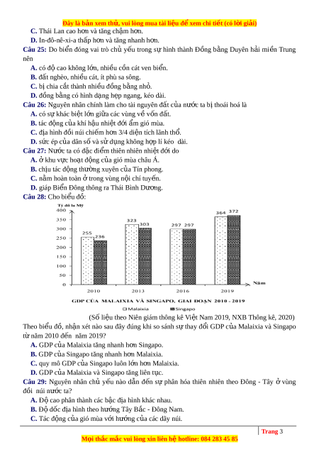D. In-đô-nê-xi-a th p ấ h n ơ và tăng nhanh h n ơ . Câu 25: Do bi n ể đóng vai trò chủ y u ế trong s ự hình thành Đ ng ồ b ng ằ Duyên h i ả mi n ề Trung nên A. có đ ộ cao không l n, ớ nhi u ề c n ồ cát ven bi n ể .