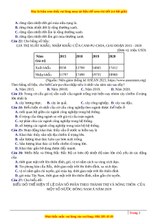 kê ASEAN 2021, https://www.aseanstats.org) Theo bảng số li u, ệ cho bi tC ế am-pu-chia nh p ậ siêu ít nh t ấ vào năm nào sau đây? A. Năm 2015. B. Năm 20018. C. Năm 2019. D. Năm 2020. Câu 23: Trong cơ c u ấ giá trị s n ả xu t ấ c a ủ ngành tr ng ồ tr t ọ hi n ệ nay nhóm cây chi m ế t ỉtr ng ọ l n ớ nhất là A. cây lư ng ơ th c ự . B. cây ăn qu . ả C. cây công nghi p. ệ D. cây rau đ u. ậ Câu 24: Bi u ể hi n ệ rõ nh t ấ c a ủ c ơ c u ấ công nghi p ệ theo ngành đư c ơ th ể hi n ệ ở A. mối quan h ệ gi a ữ các ngành công nghi p ệ trong h ệ th ng ố . B. tỉ tr ng ọ c a ủ t ng ừ ngành so v i ớ giá tr ịc a ủ toàn ngành.