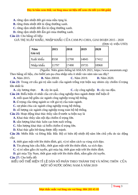 Đây là bản xem th , vu ử i lòng mua tài li u ệ đ xe ể m chi ti t ế (có l i ờ gi i ả ) A. rừng rậm nhi t ệ đ i ớ gió mùa n a ử r ng ụ lá. B. rừng thưa nhi t ệ đ i ớ lá r ng ộ thư ng ờ xanh. C. rừng rậm nhi t ệ đ i ớ ẩm lá r ng ộ thư ng ờ xanh. D. rừng rậm nhi t ệ đ i ớ ẩm gió mùa thư ng ờ xanh. Câu 22: Cho bảng s ố li u: ệ GIÁ TRỊ XU T Ấ KH U, Ẩ NH P Ậ KH U Ẩ C A Ủ CAM-PU-CHIA, GIAI ĐO N Ạ 2015 - 2020 (Đ n ơ vị: tri u ệ USD) Năm 2015 2018 2019 2020 Giá trị Xuất khẩu 8558 12700 14845 17412 Nhập khẩu 11797 17490 19735 18968 (Nguồn: Niên giám th ng ố
