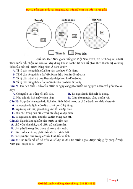 D. Tỉ lệ dân nông thôn c a ủ In-đô-nê-xi-a cao h n ơ Bru-nây. Câu 28: Du l c ị h bi n ể - đ o ả c a ủ nư c ớ ta ngày càng phát tri n ể do nguyên nhân ch ủ y u ế nào sau đây?