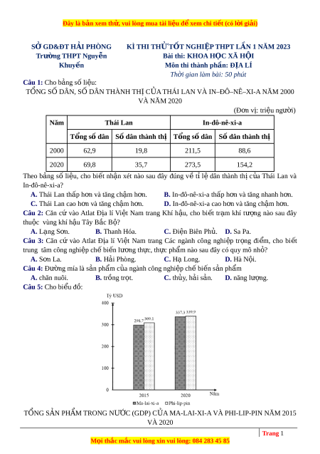 Đây là bản xem th , vu ử i lòng mua tài li u ệ đ xe ể m chi ti t ế (có l i ờ gi i ả ) SỞ GD&ĐT H I Ả PHÒNG KÌ THI TH Ử T T Ố NGHI P Ệ THPT L N Ầ 1 NĂM 2023 Trường THPT Nguy n ễ Bài thi: KHOA H C Ọ XÃ H I Ộ Khuyến Môn thi thành ph n ầ : Đ A Ị LÍ Th i