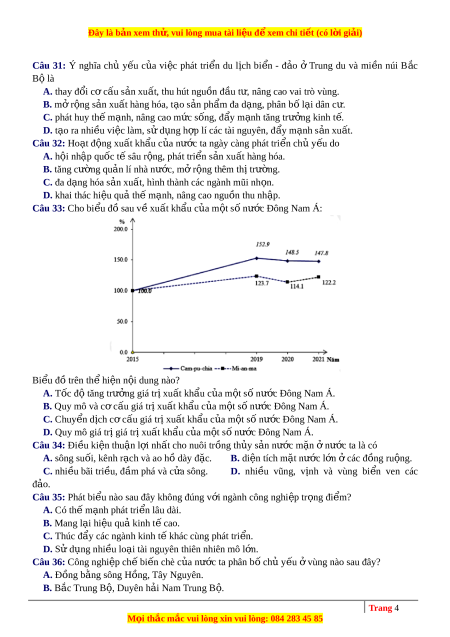 Câu 31: Ý nghĩa chủ y u ế c a ủ vi c ệ phát tri n ể du l c ị h bi n ể - đ o ả ở Trung du và mi n ề núi B c ắ B ộ là A. thay đổi c ơ c u ấ s n ả xu t ấ , thu hút ngu n ồ đ u ầ t , ư nâng cao vai trò vùng. B. m ở r ng ộ sản xuất hàng hóa, t o ạ s n ả ph m ẩ đa d ng ạ , phân b ố l i ạ dân c . ư C. phát huy th ế m nh ạ , nâng cao m c ứ s ng ố , đ y ẩ m nh ạ tăng trư ng ở kinh t . ế D. tạo ra nhi u ề vi c ệ làm, s ử d ng ụ h p