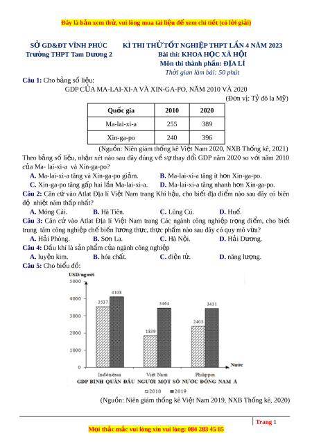 Đề thi thử Địa lí trường Tam Dương - Vĩnh Phúc lần 4 năm 2023