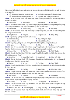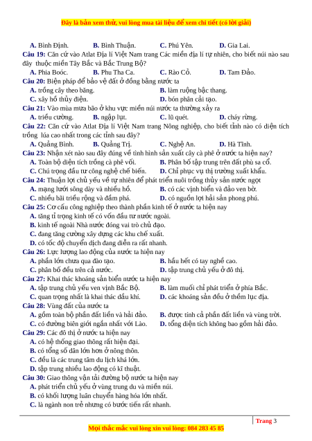 Câu 11: Căn cứ vào Atlat Đ a ị lí Vi t ệ Nam trang Vùng Duyên H i ả Nam Trung B , ộ Vùng Tây Nguyên, cho bi t ế t nh ỉ nào trong các t nh ỉ sau đây có khai thác nư c ớ khoáng? A. Khánh Hòa. B. Phú Yên. C. Bình Thuận. D. Ninh Thuận. Câu 12: Căn c ứ vào Atlat Đ a ị lí Vi t ệ Nam trang Vùng B c ắ Trung B , ộ cho bi t ế sông nào sau đây đổ ra bi n ể qua c a ử Tùng? A. Sông Chu.