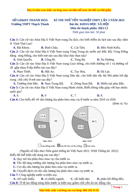 Ở GD&ĐT THANH HÓA KÌ THI TH Ử T T Ố NGHI P Ệ THPT L N Ầ 3 NĂM 2023 Trường THPT Th c ạ h Thành Bài thi: KHOA H C Ọ XÃ H I Ộ Môn thi thành ph n ầ : Đ A Ị LÍ Th i