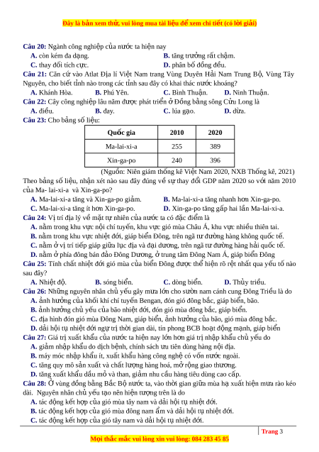 C. Ma-lai-xi-a tăng ít h n ơ Xin-ga-po. D. Xin-ga-po tăng g p ấ hai l n ầ Ma-lai-xi-a. Câu 24: Vị trí đ a ị lý v ề m t ặ t ự nhiên c a ủ nư c ớ ta có đ c ặ đi m ể là A. nằm trong khu v c ự n i ộ chí tuy n, ế khu v c
