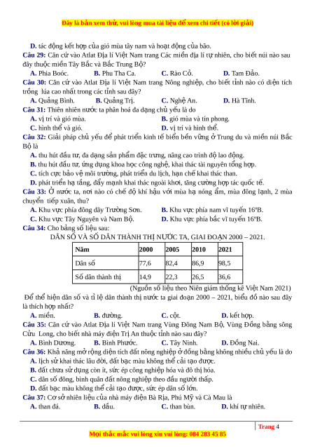 nghiệp nào sau đây có ngành s n ả xu t ấ gi y ấ , xenlulô? A. Thái Nguyên. B. Thanh Hóa. C. Vinh. D. Hải Phòng. Câu 10: Căn c ứ vào Atlat Đ a ị lí Vi t ệ Nam trang Khí h u ậ , cho bi t ế đ a ị đi m ể nào sau đây có biên độ nhi t ệ năm th p ấ nh t? ấ A. Móng Cái. B. Cà Mau. C. Lũng Cú. D. Hu . ế Câu 11: Bi n ệ pháp ch ủ y u ế phát tri n ể tr ng ồ tr t ọ ở Đ ng ồ b ng ằ Sông H ng ồ là A. thúc đẩy s n ả xuất hàng hóa, s ử d ng ụ đ t ấ h p ợ lí. B. chuy n ể đổi c ơ cấu s n ả xu t ấ , phát tri n ể v ụ đông. C. m ở r ng ộ cây ăn qu , ả đ y ẩ m nh ạ vi c ệ thâm canh.