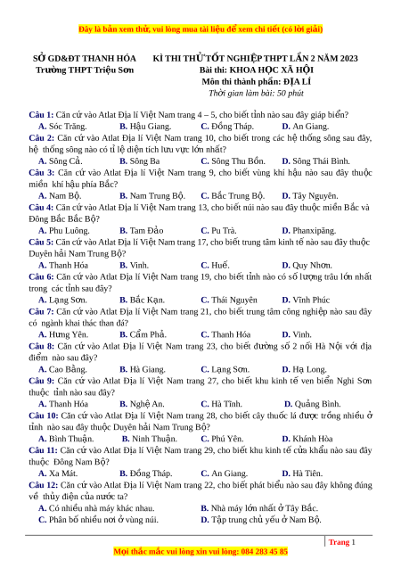 SỞ GD&ĐT THANH HÓA KÌ THI TH Ử T T Ố NGHI P Ệ THPT L N Ầ 2 NĂM 2023 Trường THPT Tri u ệ S n ơ Bài thi: KHOA H C Ọ XÃ H I Ộ Môn thi thành ph n ầ : Đ A Ị LÍ Th i