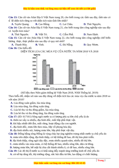 Câu 13: Căn cứ vào Atlat Đ a ị lí Vi t ệ Nam trang 20, cho bi t ế trong các t nh ỉ sau đây, t nh ỉ nào có tỉ l ệ di n ệ tích r ng ừ so v i ớ di n ệ tích toàn t nh ỉ l n ớ nh t? ấ A. Tuyên Quang. B. Cao Bằng. C. Lai Châu. D. Thái Nguyên, Câu 14: Căn c ứ vào Atlat Đ a ị lí Vi t ệ Nam trang 21, cho bi t ế trung tâm công nghi p ệ nào sau đây có luy n ệ kim màu? A. Thái Nguyên. B. Việt Trì. C. Cẩm Phả. D. Nam Định.