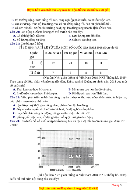 Đây là bản xem th , vu ử i lòng mua tài li u ệ đ xe ể m chi ti t ế (có l i ờ gi i ả ) B. thị trư ng ờ r ng, ộ m c ứ s ng ố r t ấ cao, công nghi p ệ phát tri n, ể có nhi u ề vi c ệ làm. C. dân c ư đông, trình đ ộ lao đ ng ộ cao, có c ơ s ở h ạ t ng ầ t t ố , dân c ư phân b ố đ u ề . D. có sức hút đ u ầ t l ư n, ớ th ịtrư ng ờ đa d ng, ạ lao đ ng ộ tăng nhanh, l c ị h s ử lâu đ i. ờ Câu 20: Lao đ ng ộ nư c ớ ta không có th ế m nh ạ nào sau đây? A. Có tính k ỷ lu t ậ r t ấ cao. B. Lực lư ng ợ tr ẻ dồi dào. C. Số lư ng ợ đông và tăng.