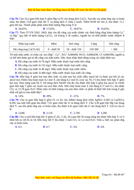 Câu 76: Cho 10,2 gam hỗn hợp X gồm Mg và Fe vào dung dịch CuCl