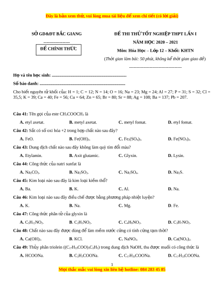 Đây là bản xem th , vu ử i lòng mua tài li u ệ đ xe ể m chi ti t ế (có l i ờ gi i ả ) SỞ GD&ĐT B C Ắ GIANG Đ Ề THI TH Ử T T Ố NGHI P Ệ THPT L N Ầ I ------------------ NĂM H C Ọ 2020 – 2021 Đ C Ề HÍNH TH C Ứ Môn: Hóa H c ọ – L p ớ 12 – Kh i ố : KHTN (Th i