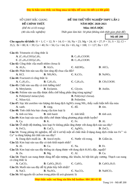 Đây là bản xem th , vu ử i lòng mua tài li u ệ đ xe ể m chi ti t ế (có l i ờ gi i ả ) S G Ở DĐT BẮC GIANG Đ Ề THI TH Ử T T Ố NGHI P Ệ THPT L N Ầ 2 Đ C Ề HÍNH TH C Ứ NĂM H C Ọ 2020-2021