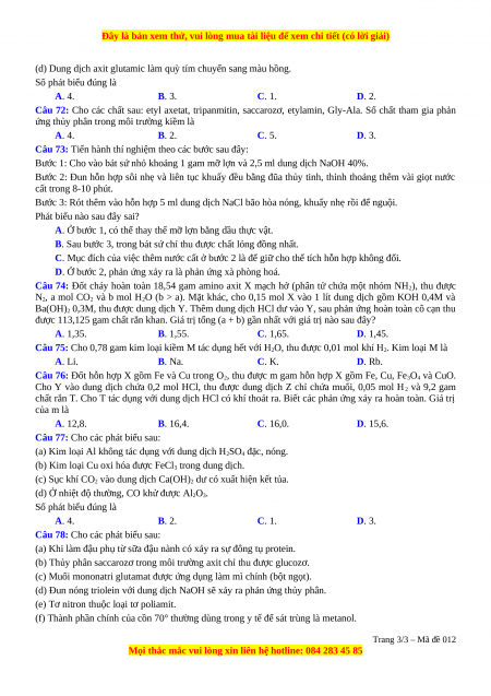 Câu 72: Cho các chất sau: etyl axetat, tripanmitin, saccarozơ, etylamin, Gly-Ala. Số chất tham gia phản