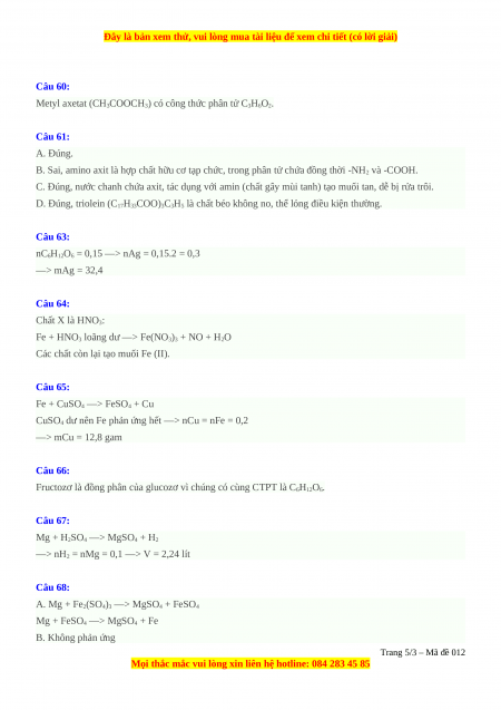 (f) Thành phần chính của cồn 70° thường dùng trong y tế để sát trùng là metanol. Trang 3/3 – Mã đề 012