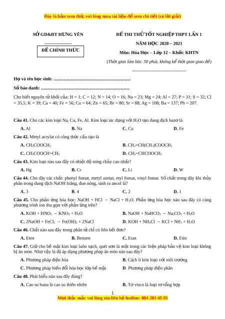 Đề thi thử Hóa Học Sở Hưng Yên lần 1 năm 2021