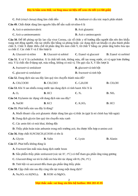 Câu 54. Etylamin tác d ng v ụ i ớ dung d c ị h nào sau đây? A. NaOH B. KCl C. K2SO4 D. HCl Câu 55. Phát bi u nà ể o sau đây là đúng? A. Mu i ố đinatri c a ủ axit glutamic đư c ợ dùng làm gia v t ị h c ứ ăn (g i ọ là mì chính hay b t ộ ng t ọ ) B. Dung d c