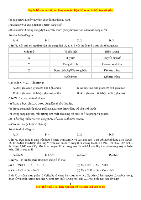 Câu 72. Tiến hành thí nghi m ệ sau: - Bư c ớ 1: Cho vào ng nghi ố m ệ 2ml nư c ớ c t ấ - Bư c ớ 2: Nhỏ ti p ế vài gi t ọ anilin vào ng ố nghi m ệ , l c ắ đ u, ề sau đó nhúng gi y ấ quỳ tím vào dung d c ị h trong ng nghi ố m ệ - Bư c ớ 3: Nh t ỏ i p ế 1ml dung d c ị h HCl đ c ặ vào ng ố nghi m ệ Cho các phát bi u s ể au: (a) Sau bư c ớ 2, dung d c ị h thu đư c ợ trong su t ố 4 M i ọ thắc m c