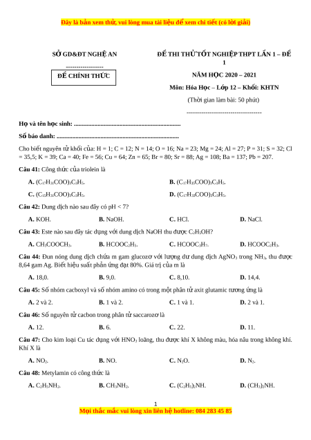 Đề thi thử Hóa Học Sở Nghệ An lần 1 năm 2021