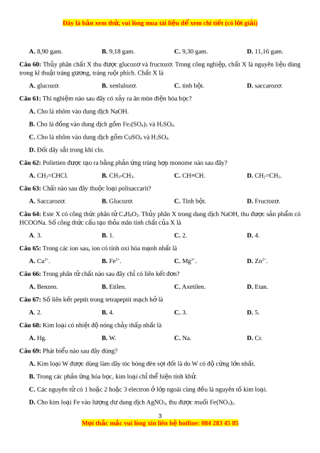 Đây là bản xem th , vu ử i lòng mua tài li u ệ đ xe ể m chi ti t ế (có l i ờ gi i ả ) A. 8,90 gam. B. 9,18 gam. C. 9,30 gam. D. 11,16 gam. Câu 60: Th y ủ phân ch t ấ X thu đư c ợ glucozơ và fructoz . ơ Trong công nghi p, ệ ch t ấ X là nguyên li u ệ dùng