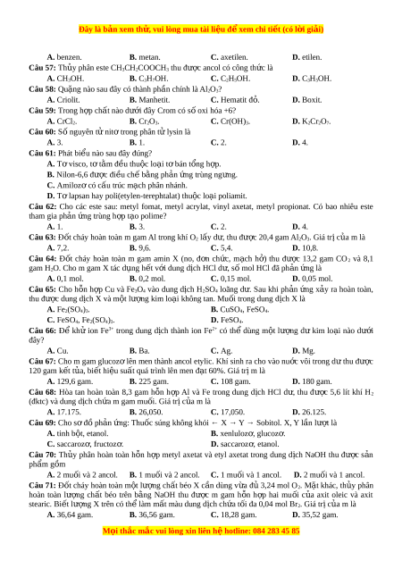 Đây là bản xem th , vu ử i lòng mua tài li u ệ đ xe ể m chi ti t ế (có l i ờ gi i ả ) A. benzen. B. metan. C. axetilen. D. etilen. Câu 57: Th y phâ ủ n este CH3CH2COOCH3 thu đư c ợ ancol có công th c ứ là A. CH3OH. B. C3H7OH. C. C2H5OH. D. C3H5OH.