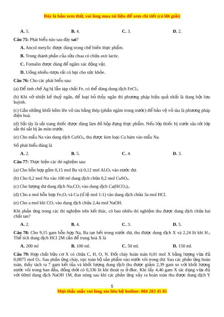 Câu 74: Cho các phát biểu sau: (a) Poli(vinyl clorua) đư c ợ dùng làm v t ậ li u ệ cách đi n, ệ ng d ố n n ẫ ư c ớ , v i ả che m a ư , da nhân t o... ạ