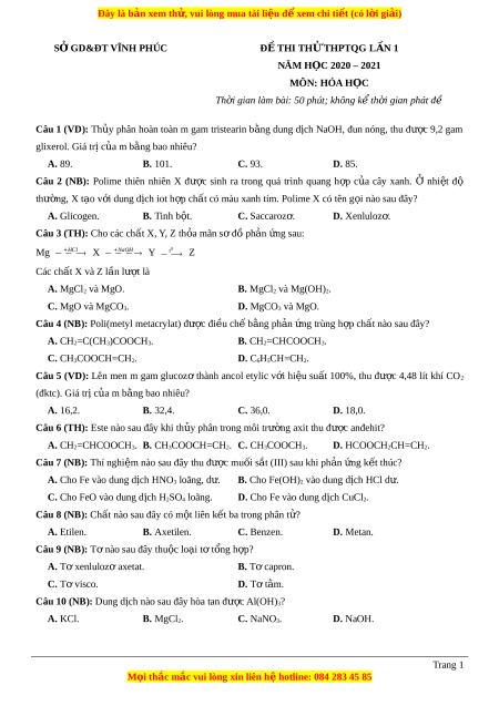 Đề thi thử Hóa Học Sở Vĩnh Phúc Lần 1 năm 2021