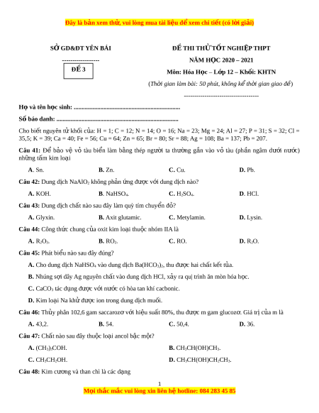 SỞ GD&ĐT YÊN BÁI Đ Ề THI TH Ử TỐT NGHI P Ệ THPT ------------------ NĂM H C Ọ 2020 – 2021 Đ 3 Ề Môn: Hóa H c ọ – L p ớ 12 – Kh i ố : KHTN (Th i